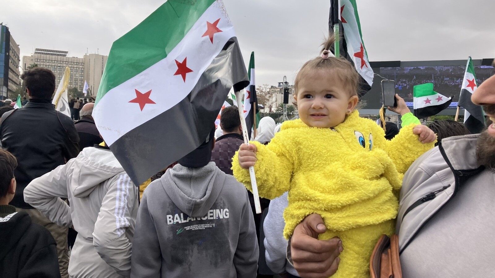 Med udstrakte lang- og pegefingre laver familien Fayyum fredstegnet mod kameralinsen. Udstyret med store smil og nationalflag i alle afskygninger fortæller de, at skal fejre årsdagen hele natten. Under hele borgerkrigen boede de i den Assad-kontrollerede hovedstad, Damaskus. Her har de været vant til, at helikoptere fra Assad og hans russiske og iranske allierede var ildevarslende. At selvsamme øredøvende brummen fra rotorbladene nu betyder frihed, er både obskurt og lykkeligt, fortæller de. Det fylder dem med stolthed. Helikopterforestillingen er et flyvende vidnesbyrd om, at det er dem, folket, der har vundet over Assad-regimet og dets undertrykkelse.