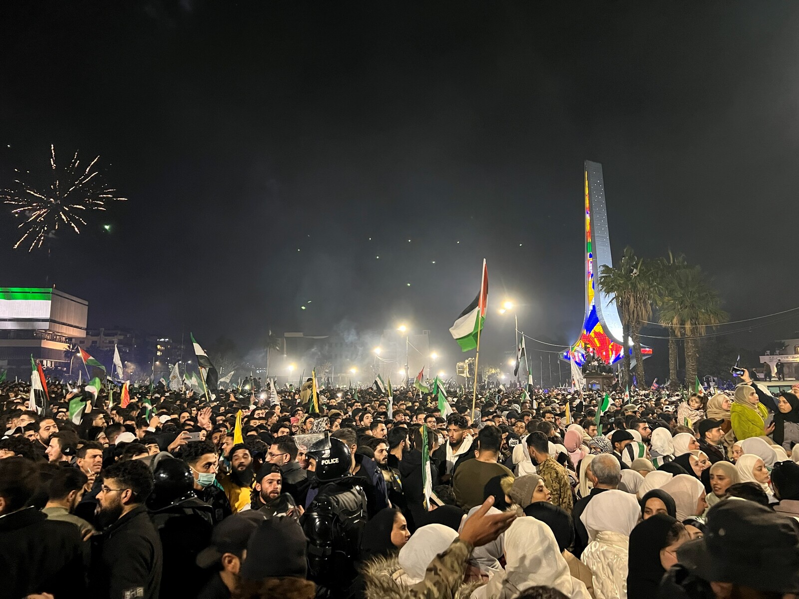 På pladsens storskærm kan man følge frihedsfejringen i andre syriske storbyer som Homs, Latakia og Aleppo. Livetransmissionen fra de andre byer må dog vige, da overgangsregeringens præsident, Ahmed al-Sharaa, ved 18-tiden går på talerstolen andetsteds i Damaskus. De direkte billeder og løfterne om en bedre fremtid udløser jubelbrøl på Umayyadepladsen.