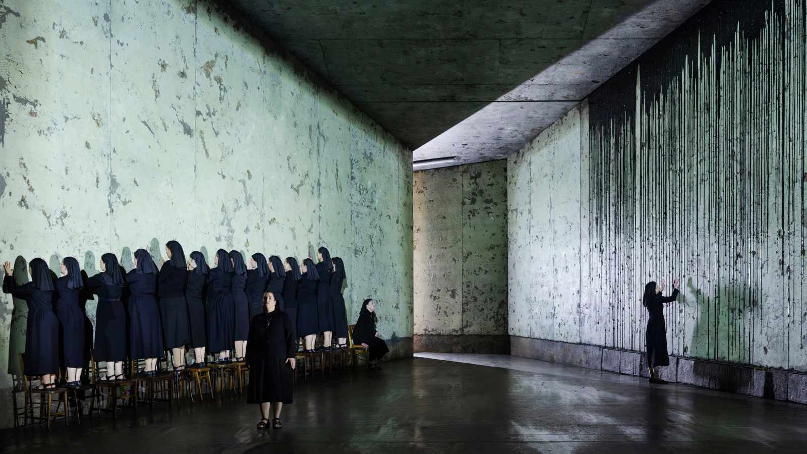 Dramaet udspiller sig inden for de snævre rammer af én scenografi: en langstrakt korridor indrammet af to vægge, der skråner mod hinanden. Et rum levendegjort af de to diagonaler. Det føles som en form for gravkammer – eller er det blot klosterets kapel?
