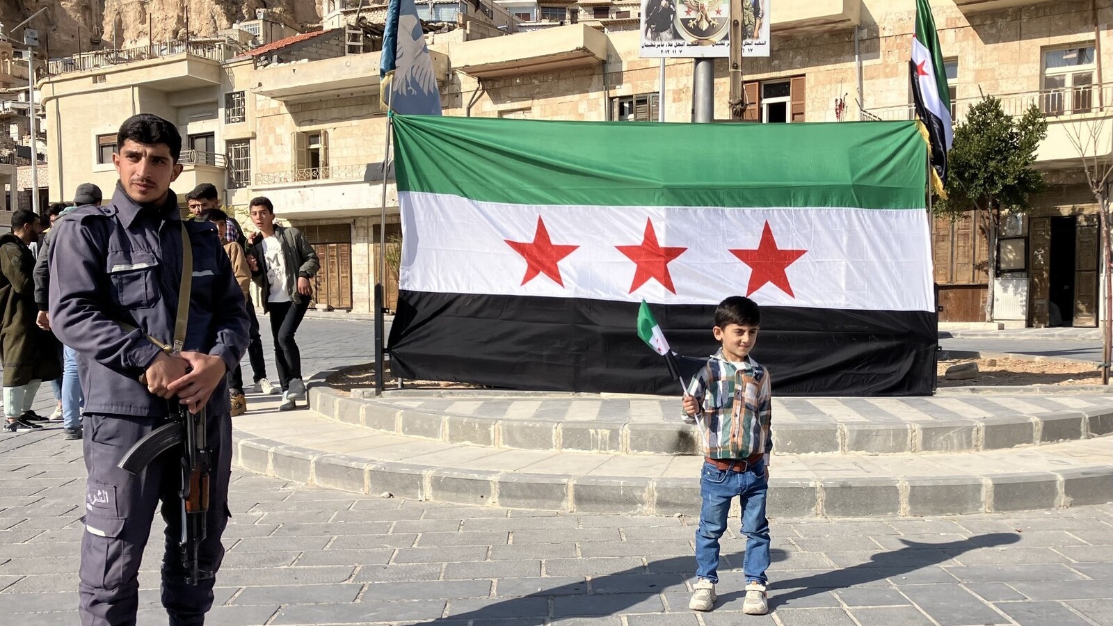 Et niveau højere oppe i byen cirkulerer en bil rundt med et flag over kølerhjelmen. Halvvejs ude af bagsædets sidevinduer hænger børn og lader selvsamme flag vejre i vinden. Flagenes øverste horisontale stribe er rød og ikke grøn, som det var tilfældet for nationalflaget under Assad-regimet. Den midterste hvide stribe er prydet af tre røde, femtakkede stjerner og ikke længere to grønne.