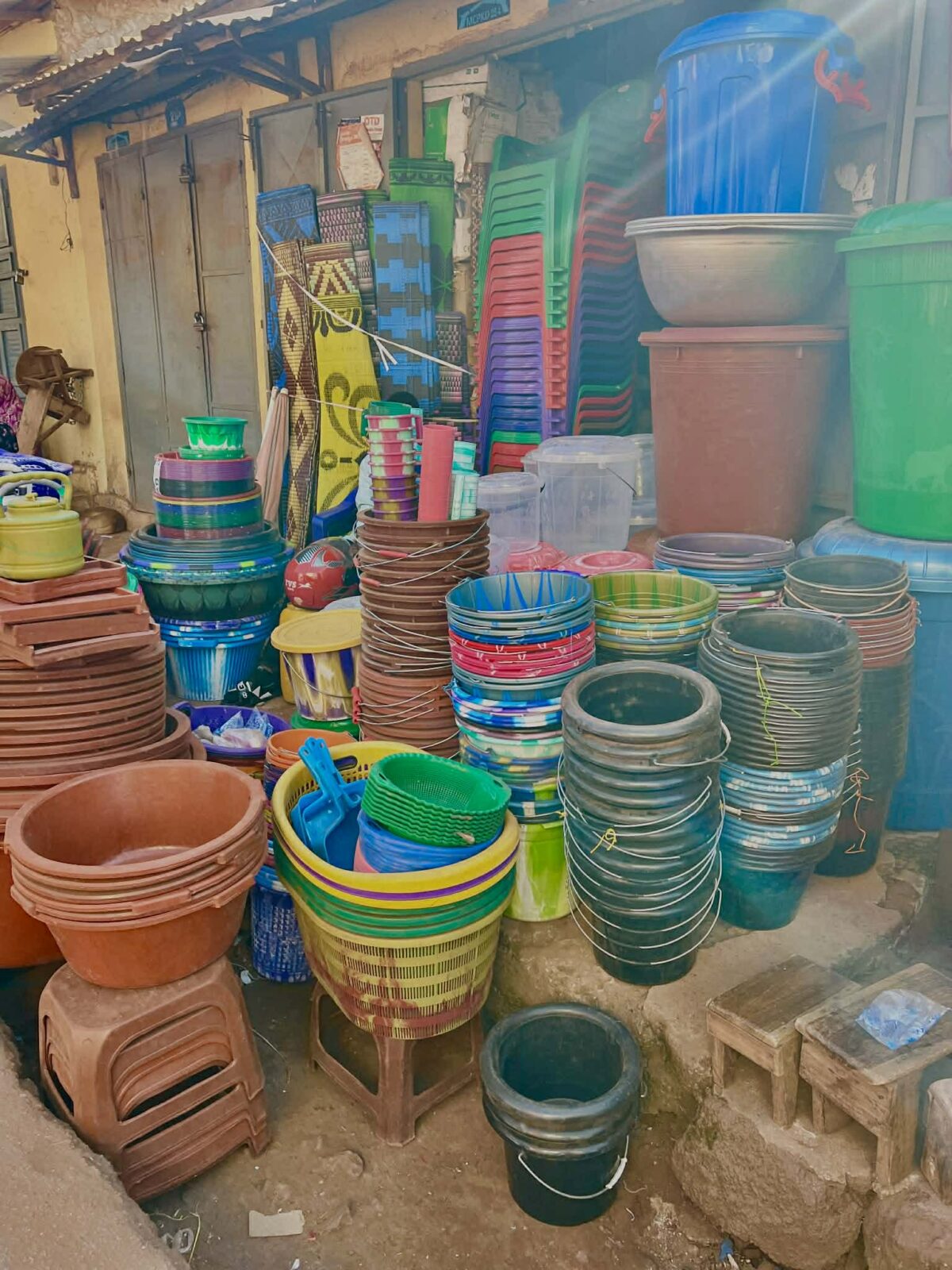 De samme, der findes overalt i Afrika: vandkander, baljer, spande. Made in China. Designet virker næsten ligegyldigt, men funktionaliteten er uovertruffen. Plastikken har for længst udkonkurreret både ler og kalabasser – på pris, på holdbarhed og på tilgængelighed.