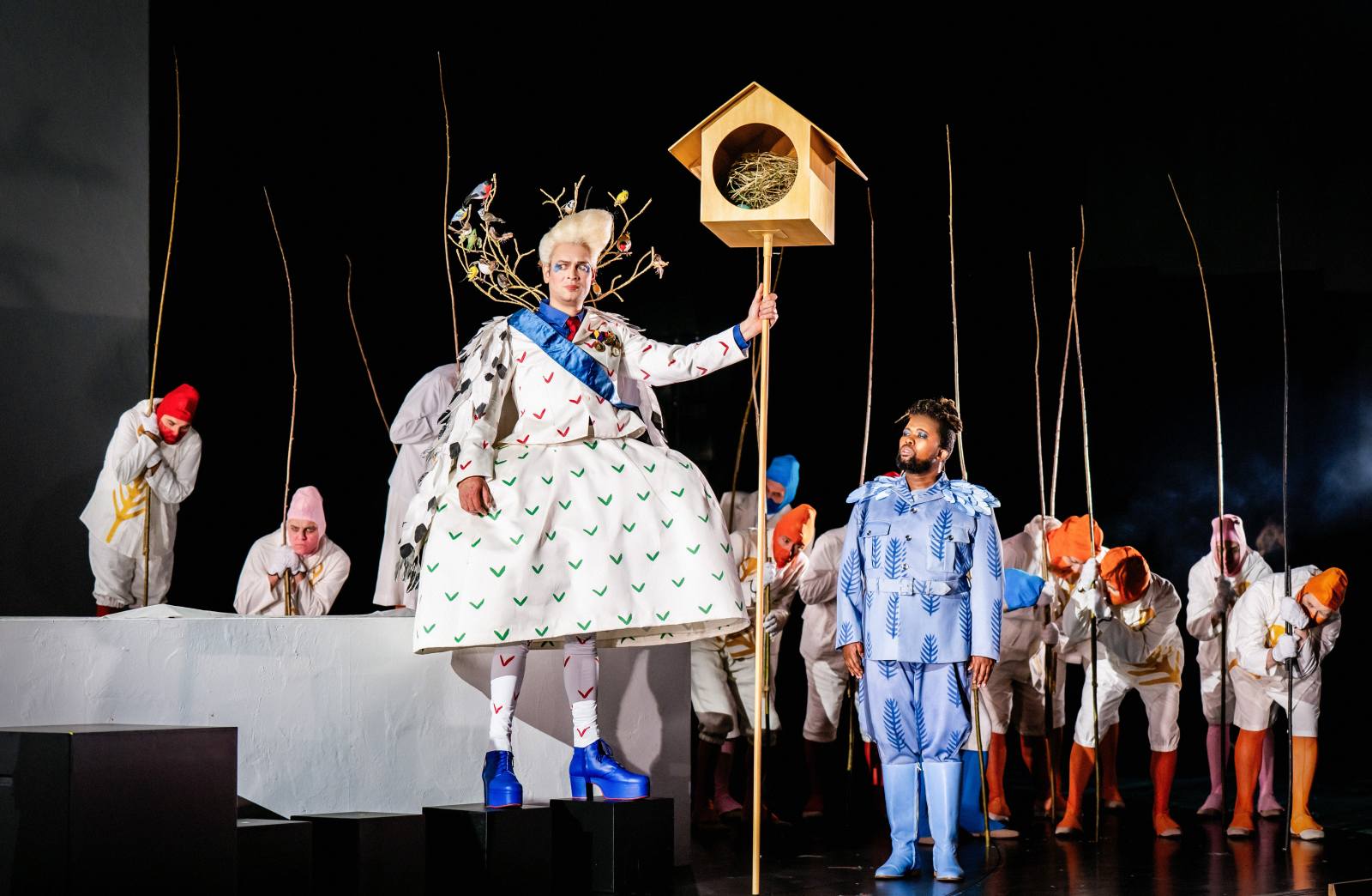 Ja, undertiden hopper Kong Heinrich i sin halvanden meter brede barokke kongedragt rundt på en stor motionsbold, mens han holder fast i sin kongestav, der har form som et kosteskaft med et fuglehus øverst oppe. Her slipper forestillingen ethvert tag af alvor i sin platte og letkøbte skildring af fuglekongens magt og brutalitet, og det hele bliver til blot og bar morskab ad libitum.