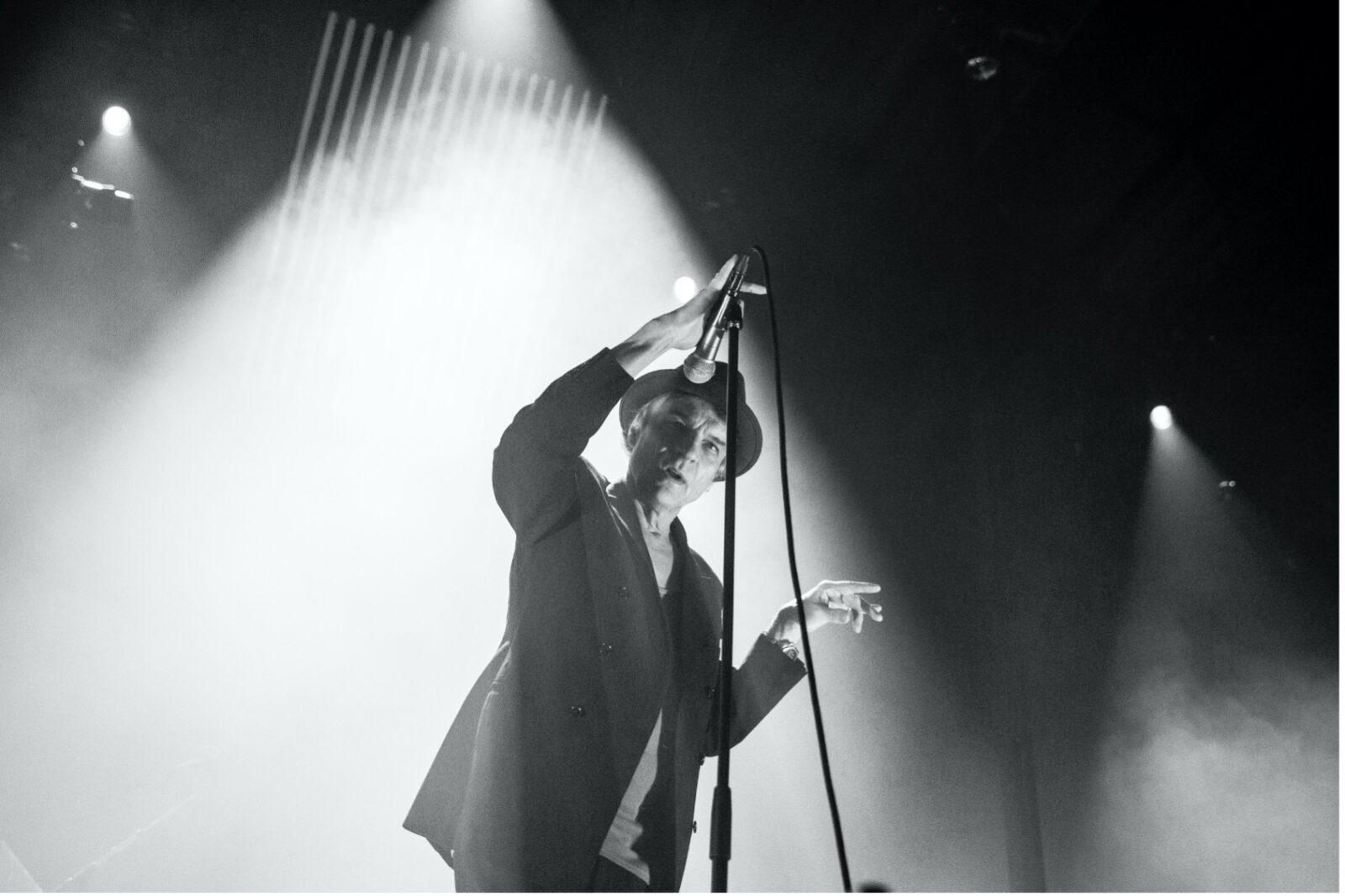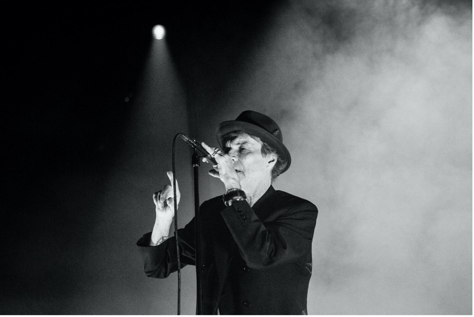Thåström ligner et vejrbidt fugleskræmsel med bulet hat. Skæv, knoklet og med arme og ben strittende i skæve vinkler, står han ved mikrofonen i den hvide røg. Hans stemme er mørk og rusten.
