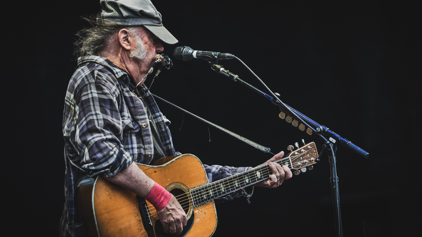 Så satte Young sig ned med sin akustiske guitar og leverede en fin version af klassikeren “The Needle and the Damage Done”. Her lød han, som han skal lyde