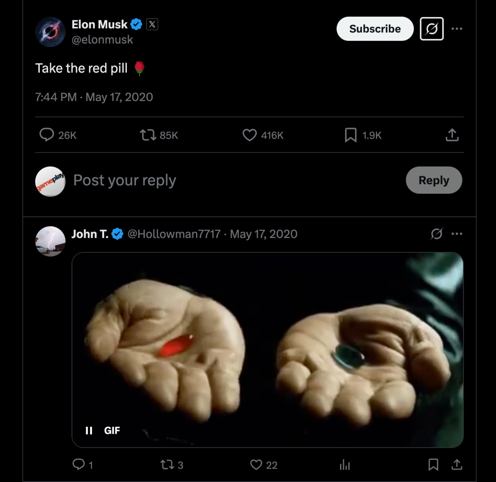 Curtis Yarvin anvendte red-pilling som en beskrivelse af, hvordan det er at vågne op, erkende demokratiets, egalitarismens og progressivismens svigt og forstå, at autokrati er den eneste løsning på samfundets problemer. Det er først og fremmest en metafor for at frigøre sig af alle sine illusioner og forhåbninger og bekende sig til kynisk realisme.