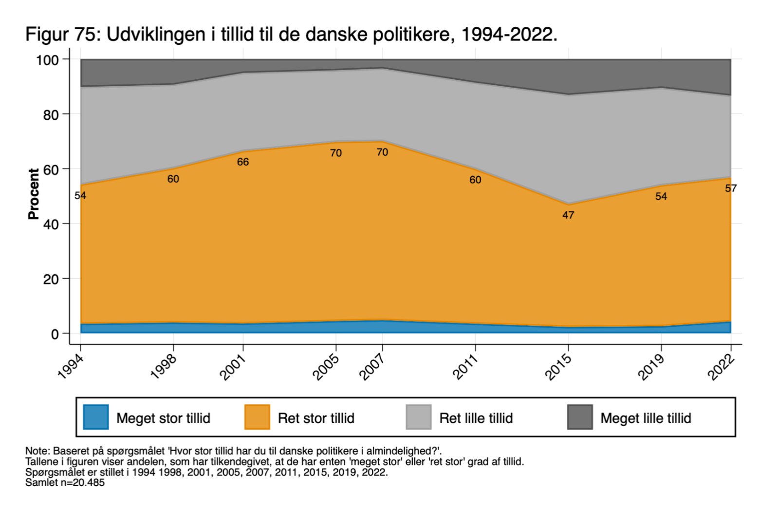 Valgprojektet konkluderede i Valgundersøgelsen 2022, at mængden af danskere, der har ”meget lidt tillid” til de danske politikere, udgør 15 procent.