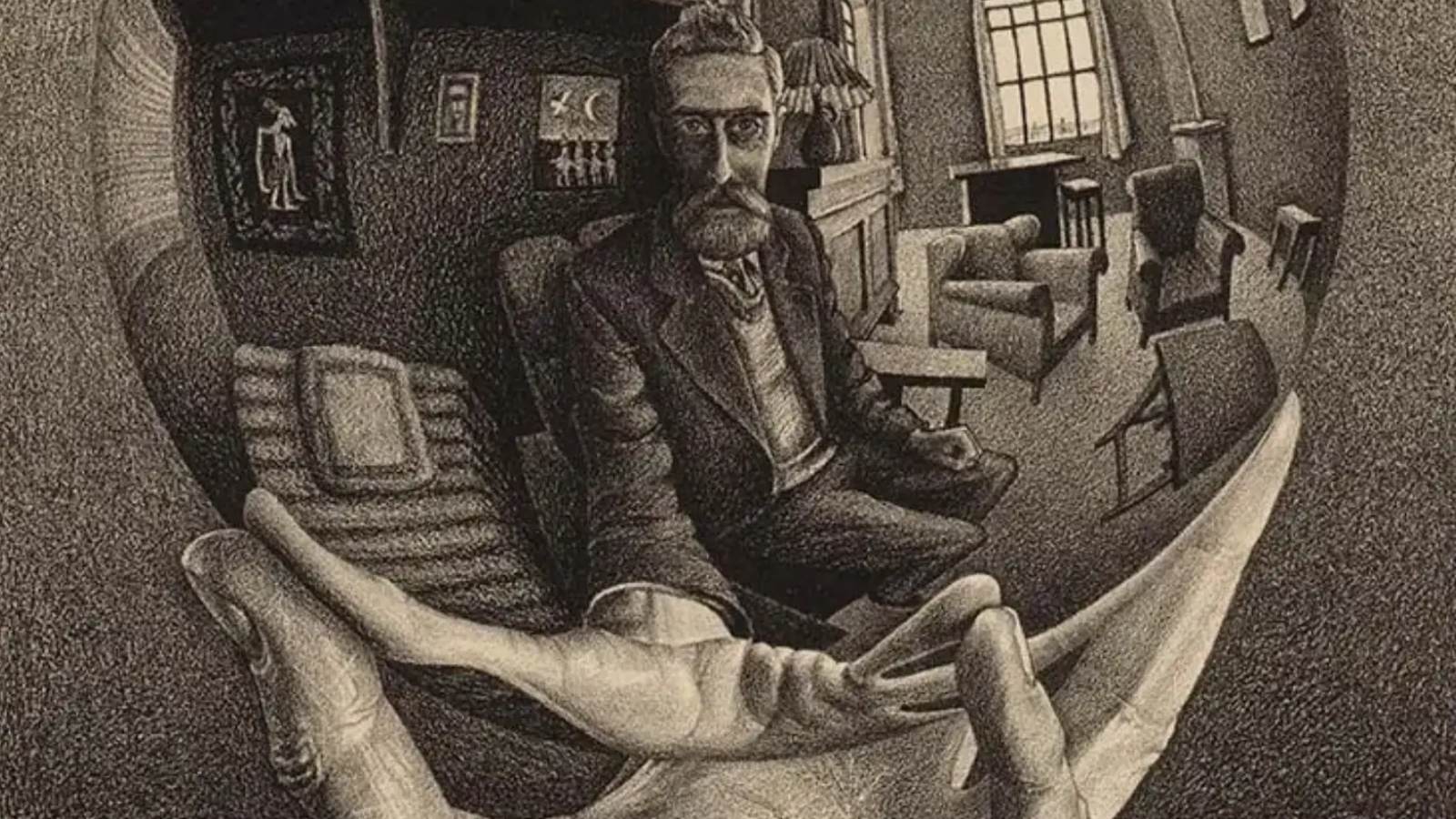 Dette selvportræt er også kendt som Hånd med spejlende sfære. Spejlbilledet viser Escher i færd med at tegne kuglen, sig selv og rummet omkring ham i baggrunden. På væggene hænger adskillige indrammede billeder, bl.a. et af en indonesisk wayang, en skyggedukke.