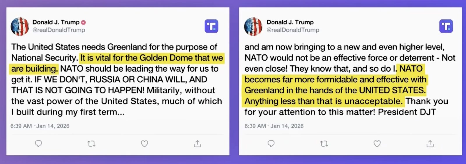 Grønland er nemlig også koblet direkte til centrale amerikanske sikkerhedspolitiske projekter, især det kommende, nye missilforsvar ”Golden Dome”. Ved at knytte Grønland til et konkret forsvarsprojekt giver Trump ønsket om kontrol over øen en ny, stærk indenrigspolitisk motor, der ikke er blevet talt så meget om i det danske, nemlig amerikanske arbejdspladser, forsvarsindustrien og supermagtens budgetter.