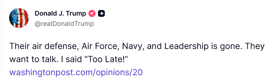 USA’s præsident Donald Trump har samtidig signaleret, at Washington ikke har planer om at standse offensiven foreløbig. “Deres luftforsvar, luftvåben, flåde og ledelse er væk. De vil tale. Jeg sagde: For sent!”, skrev Trump på sin platform Truth Social om de amerikansk-israelske angreb mod Iran.